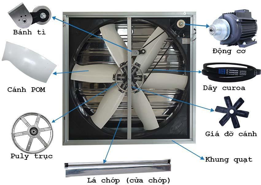 Quạt hút công nghiệp 1380x1380 - công suất 1100W - Đường kính cánh 1250mm - Chớp che mưa đóng mở tự động - Điện áp 380V - Tốc độ 427rpm - Lưu lượng 44500m3/h - Độ ồn 70Db - Công dụng thông gió nhà xưởng, nhà kho, Bảo hành 12 tháng