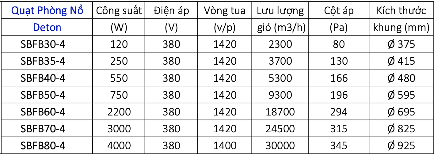 Quạt tròn phòng nổ Deton SBFB80-4, Công suất: 4000W - Điện áp: 380V - Vòng tua: 1420 v/p - Lưu lượng gió: 30000 m3/h - Cột áp: 345 Pa - Bảo hành: 12 tháng - thiết kế chắc chắn, hoạt động bền bỉ, an toàn tuyệt đối trong môi trường dễ cháy nổ.